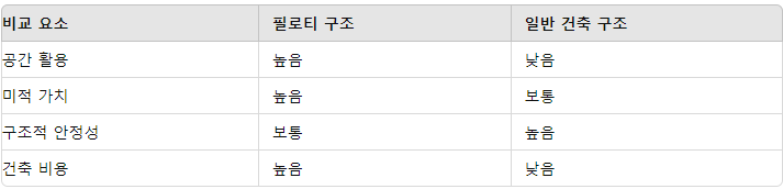 필로티 구조와 일반적인 건축 구조를 비교해보면, 그 차이점을 명확히 알 수 있습니다. 일반적인 건축 구조는 모든 층이 지면에 닿아 있으며, 공간 활용도와 개방감이 상대적으로 낮습니다. 반면, 필로티 구조는 지상층을 개방하여 다양한 용도로 활용할 수 있으며, 건물의 미적 가치를 높여줍니다.